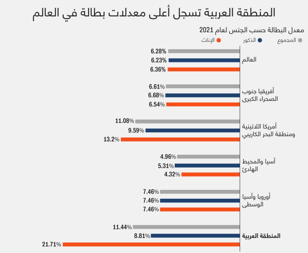 ويظهر الإنفوغرافيك أيضاً مجموع نسبة البطالة للذكور والإناث معاً إلى 11.44 % في المنطقة العربية لعام 2021 أي الأعلى بين مناطق العالم، وتلتها أمريكا اللاتينية ومنطقة البحر الكاريبي بنسبة 11.08 %.
