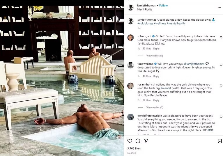 وكان آخر منشور نشره العارض الأمريكي عبر حسابه في “إنستغرام” في ذات يوم وفاته، إذ ظهر وهو في مغطس ماء، معلقًا: “مغطس ماء بارد يحميك دائما من الطبيب”.